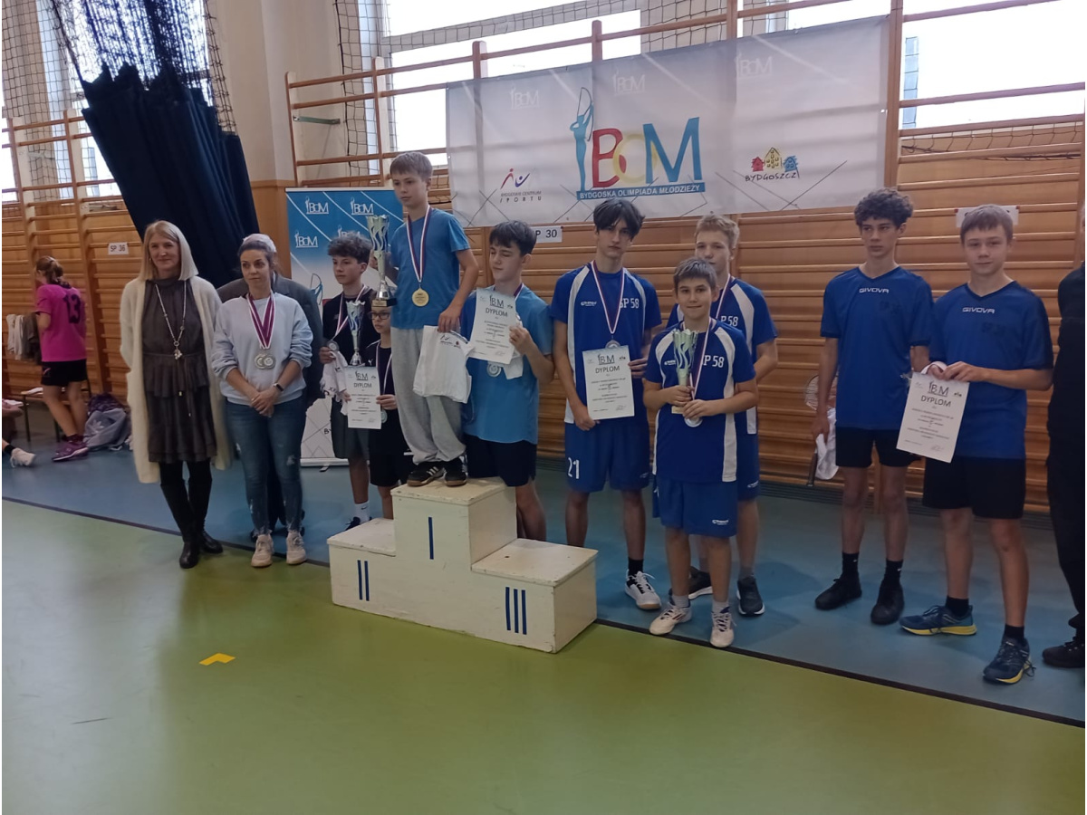W dniach 13 i 18 listopada, w SP nr 16 w Bydgoszczy, odbyły się Igrzyska Dzieci i Młodzieży w badmintonie, rozgrywane w ramach Bydgoskiej Olimpiady Młodzieży. W rozgrywkach tych, naszą szkołę reprezentowała wyjątkowo duża liczba zespołów- 5. Szczególnie męski zespół młodzieży (klasy VII, VIII) nie ukrywał apetytów na najwyższe lokaty. Zespoły dzieci (chłopców i dziewcząt klas V, VI) dopiero w tym roku szkolnym rozpoczęły treningi badmintonowe, zatem w mistrzostwach startowały „po naukę”. Jednak los bywa przewrotny. To właśnie nasi młodzi chłopcy w składzie: Mateusz Piekarski, Nathan Tomasik (obaj z 5s), oraz Kajtek Bielicki z 6s sprawili miłą niespodziankę i zajęli świetne drugie miejsce, ustępując w finale jedynie „Katolikom”.