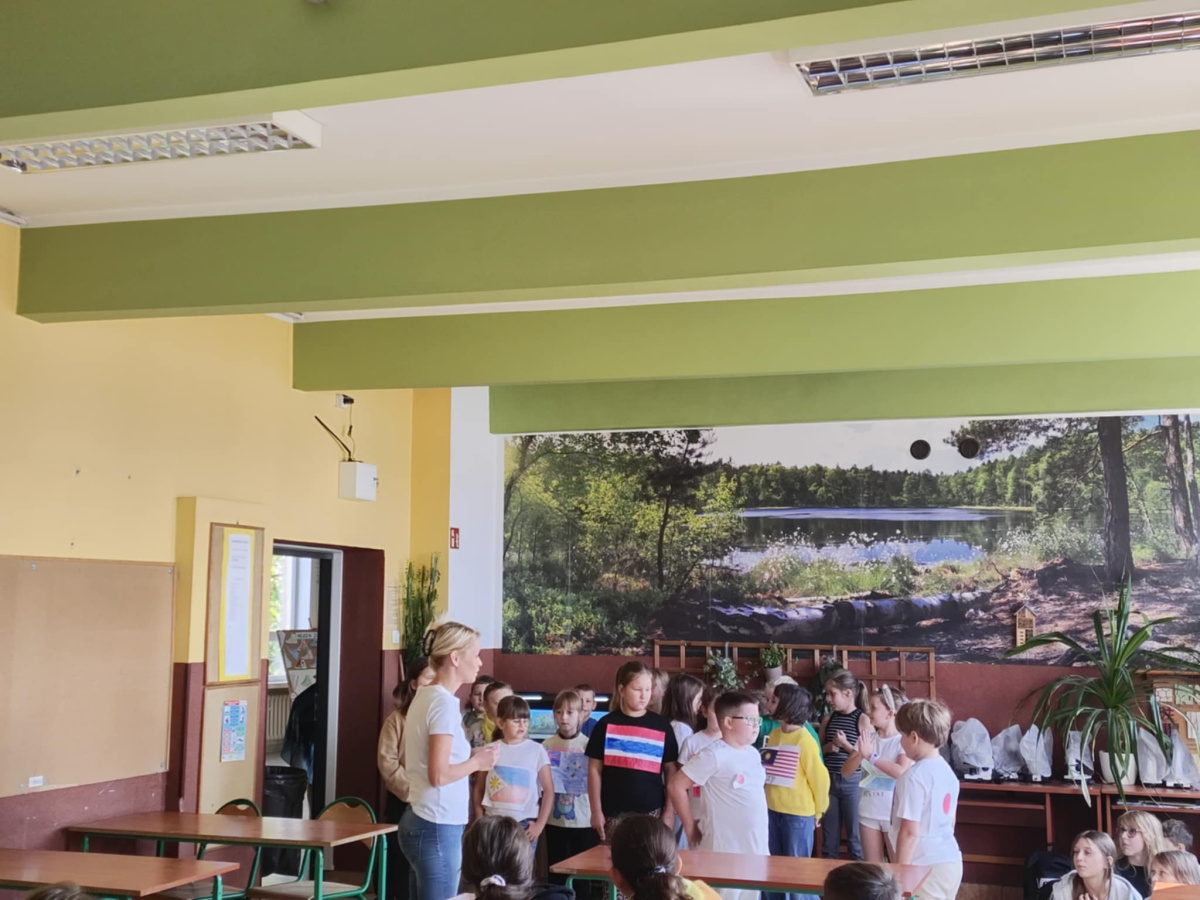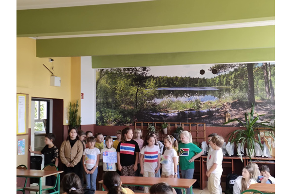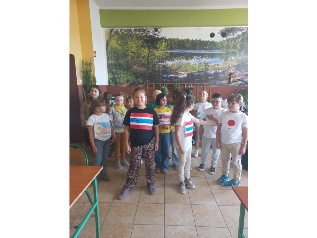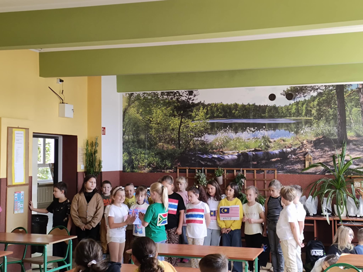 Obchody rozpoczęli uczniowie klasy 2a, którzy przygotowali wyjątkowy występ artystyczny. Zaśpiewali piosenkę w kilku językach oraz zaprezentowali powitania z różnych zakątków świata. Ich radość i zaangażowanie wprowadziły wszystkich w doskonały nastrój i zachęciły do dalszej wspólnej zabawy z językami. Następnie uczniowie klas 4–6 wzięli udział w quizie wiedzy o Europie. Musieli wykazać się znajomością map, charakterystycznych miejsc, symboli narodowych oraz powitań w językach różnych krajów. Emocje sięgały zenitu, a rywalizacja przebiegała w duchu dobrej zabawy i współpracy.