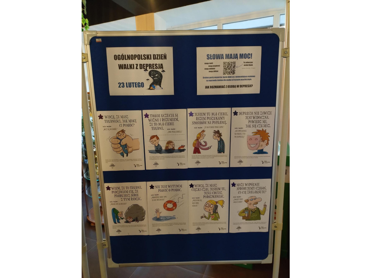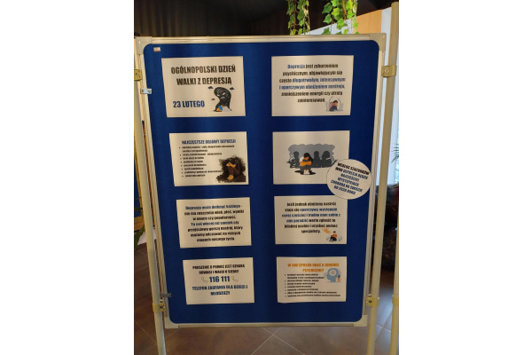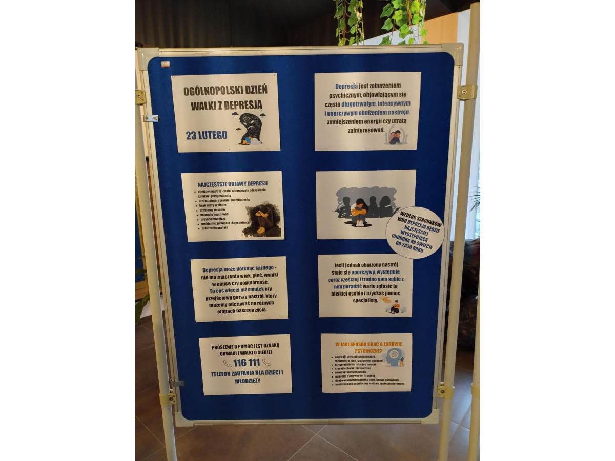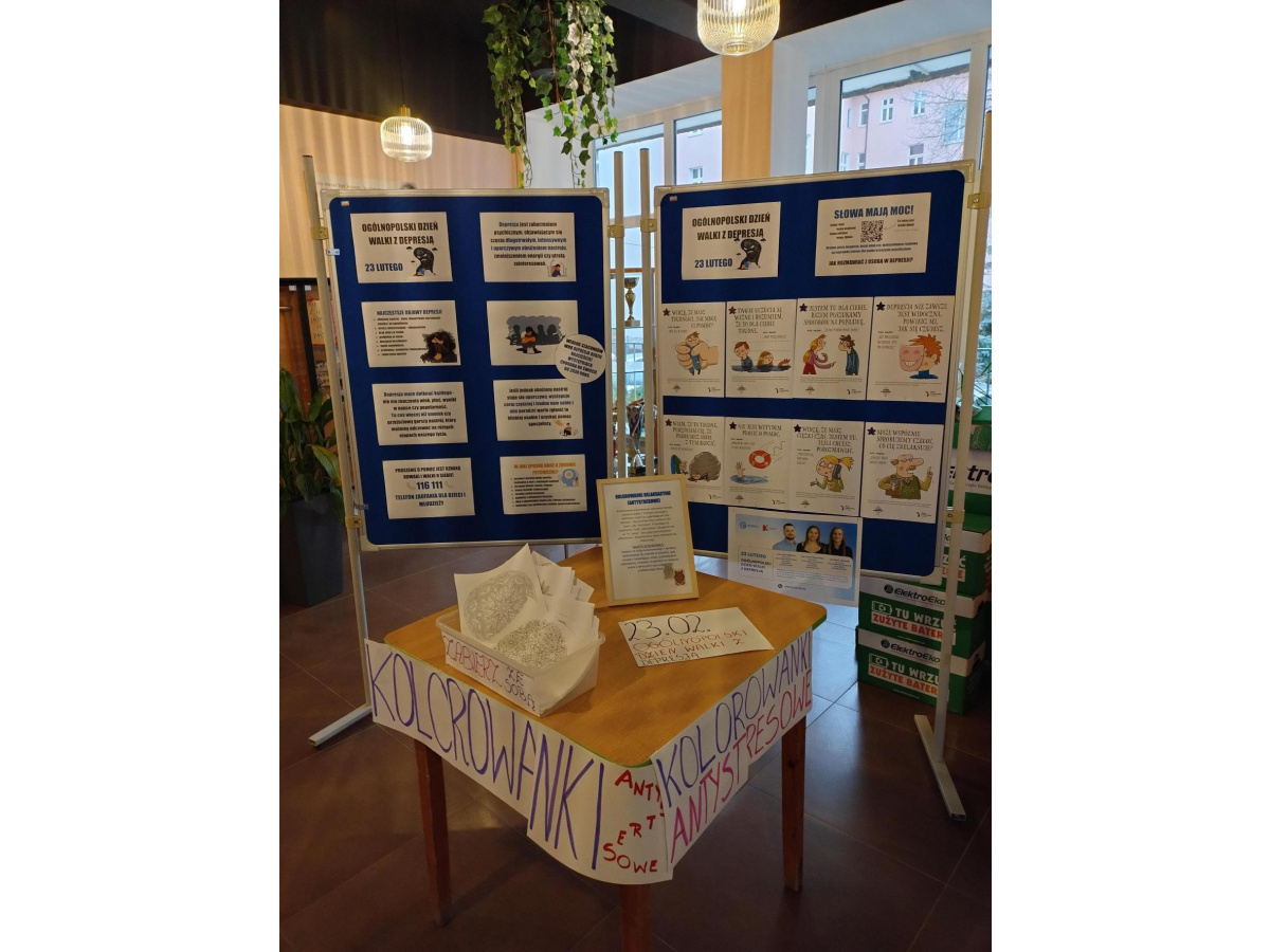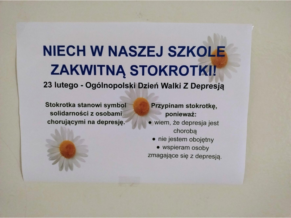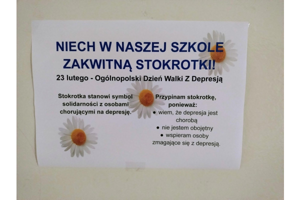 W poniedziałek (23 lutego) obchodzony jest Ogólnopolski Dzień Walki z Depresją. W naszej szkole prowadzone były działania profilaktyczne, zwiększające świadomość społeczną na temat depresji. Na korytarzach szkolnych pojawiły się gazetki poświęcone specyfice choroby. Podczas lekcji wychowawczych uczniowie mieli możliwość poszerzenia swojej wiedzy dzięki oglądanym filmikom edukacyjnym i profilaktycznym oraz przygotowanym plakatom klasowym. W poniedziałek zarówno nauczyciele, jak i uczniowie założyli kolorowe ubrania oraz przypięli do nich symboliczną stokrotkę, stanowiącą oznakę solidarności z osobami chorującymi. Przy drzwiach wejściowych pojawiły się kolorowanki relaksacyjne (antystresowe), gotowe do zabrania ze sobą przez uczniów, nauczycieli i rodziców.