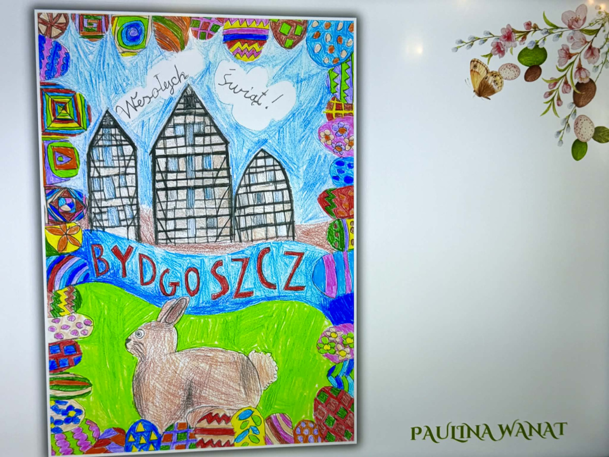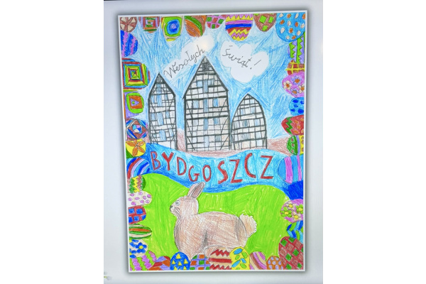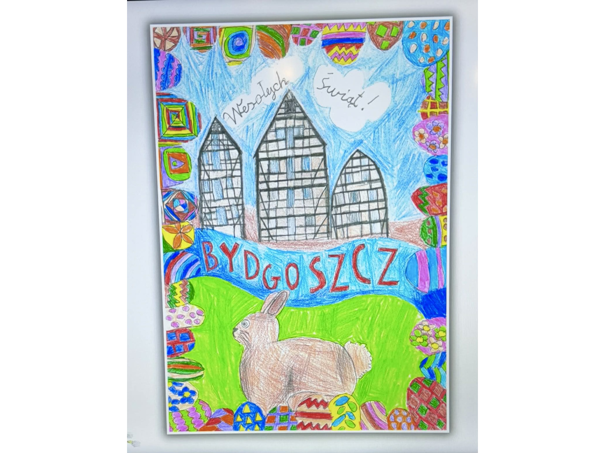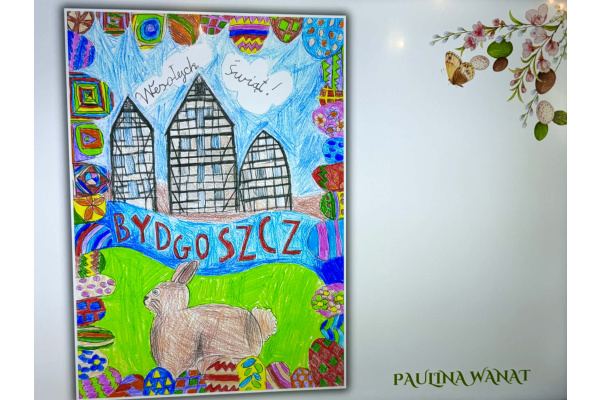 Nasi uczniowie klas I-III wzięli udział w konkursie organizowanym przez Urząd Miasta Bydgoszczy na Kartkę Wielkanocną z motywem Bydgoskim. Na tegoroczny konkurs wpłynęło ponad 350 prac z 38 bydgoskich szkół. Komisja konkursowa przyznała 3 nagrody główne, a 15 prac wyróżniła. Z dumą informujemy, że wśród wyróżnionych kartek wielkanocnych znalazła się praca naszej uczennicy Pauliny Wanat z klasy IIIc.