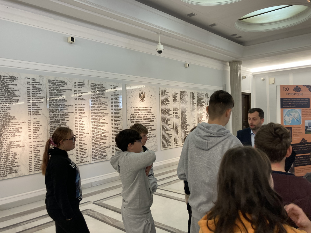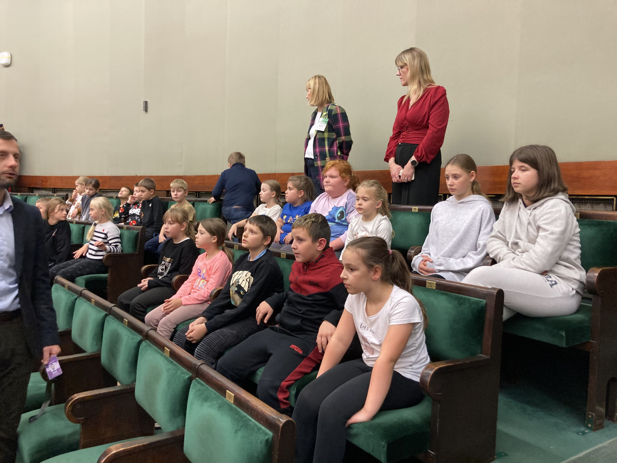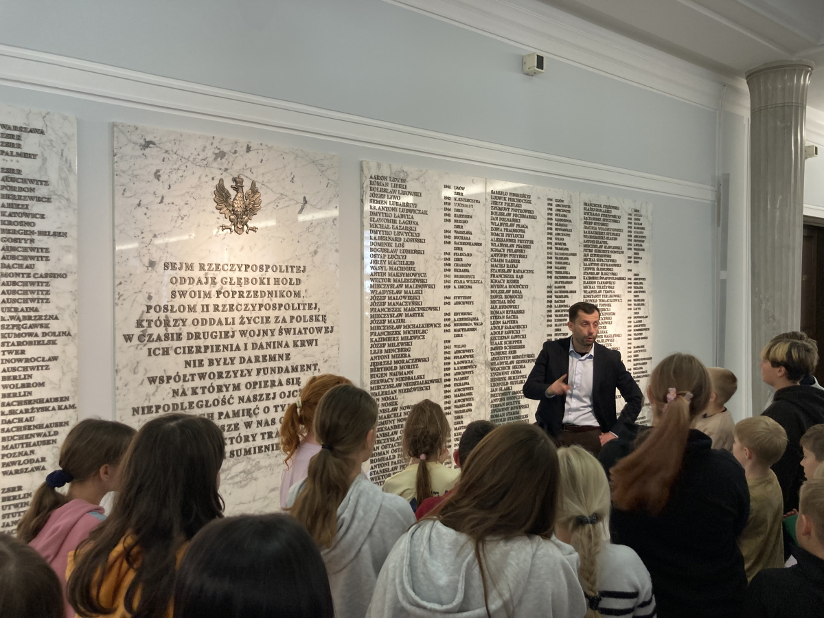 Następnie uczestnicy wycieczki udali się do Parlamentu Rzeczypospolitej Polskiej, dzieci miały niezwykłą okazję zwiedzić budynki Sejmu i Senatu wraz z przewodnikiem. Przysłuchiwały się również obradom Sejmu z galerii sejmowej, gdzie przywitał je Wicemarszałek Piotr Zgorzelski, oraz odwiedziły salę obrad Senatu. Potem przyszedł czas na zwiedzanie z przewodnikiem Stadionu Narodowego. Po długim i intensywnym dniu spędzonym w stolicy Polsk uczniowie wrócili do domu pełni pozytywnych przeżyć i zadowoleni z niezwykle udanej wycieczki.